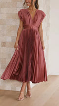 Timeless Elegance – The V-neckline and flowing pleats create a classic, stylish look.