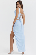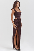 A bold dress that sculpts the silhouette with modern lines and enticing details. The structured top accentuates the neckline, while the side cut-outs and deep split create a play of shapes that does not go unnoticed. Perfect for elegant evenings, glamorous events, or occasions where you want to shine with style and confidence.