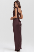 • Features: Simple neckline, wide straps, cut-out detail at the hips, deep side split.